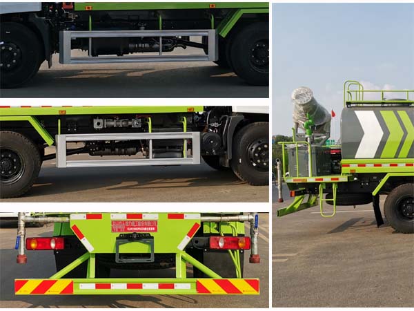 其它 | ABS型號:3631010-C2000,VIE ABS-Ⅱ;ABS生產(chǎn)企業(yè):東科克諾爾商用車制動系統(tǒng)(十堰)有限公司,浙江萬安科技股份有限公司;選裝描述:隨底盤選裝駕駛室,選裝不帶噴霧機組后平臺;側(cè)后防護情況:均采用Q235B材質(zhì),均采用螺栓連接,后下部防護尺寸:150×50(mm),離地面高度450mm;罐體總?cè)萘?立方米):9.77立方米、罐體有效容積(立方米):9.31立方米,罐體尺寸(罐體長×長軸×短軸)(mm)為4300×2150×1480;專用功能及裝置:專用裝置:罐體、灑水泵和噴霧機組,主要用于路面灑水及園林綠化;不裝噴霧機組時,專用裝置為灑水泵和罐體;其他說明:整車長度(mm)/前懸(mm)的對應關(guān)為:7985/1475,7830/1320,8025/1515;當選裝帶噴霧機組時,整備質(zhì)量為6955kg,額定載質(zhì)量(kg)/準乘人數(shù)(人)對應關(guān)系為:8850/3,8915/2;當選裝不帶噴霧機組時,整備質(zhì)量為6635kg,額定載質(zhì)量(kg)/準乘人數(shù)(人)對應關(guān)系為:9170/3,9235/2。僅采用發(fā)動機D4.0NS6B170,D4.0NS6B195,B6.2NS6B210,YCS04180-68,YCY30165-60:選裝罐體涂裝外觀,選裝前沖霧炮,選裝立式水冷霧炮機組、自流口和后對沖,選裝大平臺的高位花灑、臥式水冷霧炮機組,選裝霧炮樣式。選裝踏梯樣式,選裝塑料輪罩。 | ||