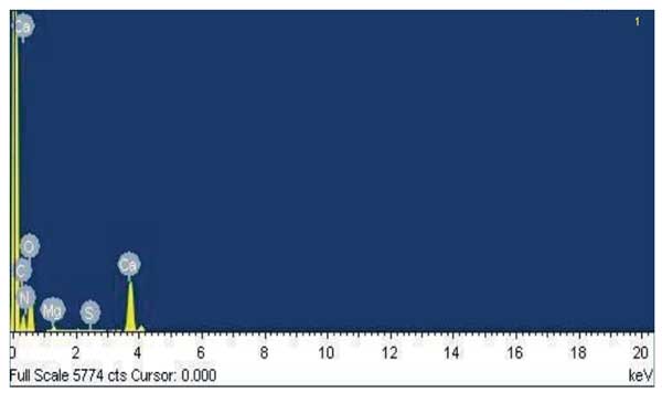 活性炭的表面化學成分是通過使用能量色散X射線(EDX)光譜確定的。得到的光譜見圖2,C、N、0、Mg、Ca的百分比分別為7.64%、14.53%、35.31%、0.70%、41.80%。FTIR結(jié)果支持C、N和O的存在,該結(jié)果表明存在羰基和胺基團。除此之外,高百分比的Ca表明主要是鈣的性質(zhì)。此外,光譜中出現(xiàn)Mg表明Mg化合物與碳和氧強烈結(jié)合。因此,無論是用熱蒸餾水還是冷蒸餾水,都不容易通過洗滌去除。