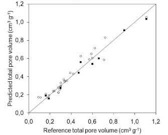 將29個(gè)樣品的測(cè)試組用于測(cè)試該總體孔體積預(yù)測(cè)的方程。根據(jù)圖6所示的圖表,預(yù)測(cè)值和參考值之間有很好的一致性。觀察到0.04cm 3 g -1的平均絕對(duì)誤差和13.4%的平均相對(duì)誤差。表3給出了模型的統(tǒng)計(jì)參數(shù)。