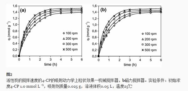 可以看出,吸附速率受攪拌速度的影響很大 - 吸附速率隨攪拌速度顯著增加。隨著攪拌速率從100rpm增加到500rpm,k 2值分別從0.577增加到1.264g mmol -1 h -1(機械攪拌器)和0.560-1.231g mmol -1 h -1(磁力攪拌器)。在相同的攪拌速度下,機械攪拌器和磁力攪拌器之間的差異沒有統(tǒng)計學(xué)意義(p > 0.05)。隨著攪拌速度的提高,4-CP分子從大塊液體向活性炭顆粒周圍的液體邊界層擴散的速率變得更高,這是因為紊流的增強和液體厚度的減小邊界層。隨著攪拌速度的增加,吸附劑顆粒破碎的程度增加,這種效果可能會進(jìn)一步增強。在這些研究中,試驗前和試驗后的吸附劑的顆粒大小沒有測定,但在4-CP的吸附動力學(xué)的活性炭的粒子大小的影響是有據(jù)可查的。還描述了攪拌速度吸附率的增加為堿性染料的吸附上活性白土[ 6 ]以及乙酸,吡蟲啉和4-氯苯酚在活性炭上。
