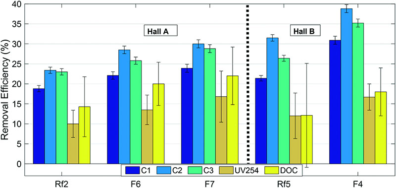 圖2:改造后的(F6,F(xiàn)7和F4)和參考(Rf2和Rf5)過濾器中活性炭對有機物級分的去除效率。誤差棒表示通過誤差傳播計算的標(biāo)準(zhǔn)誤差(N=4)。