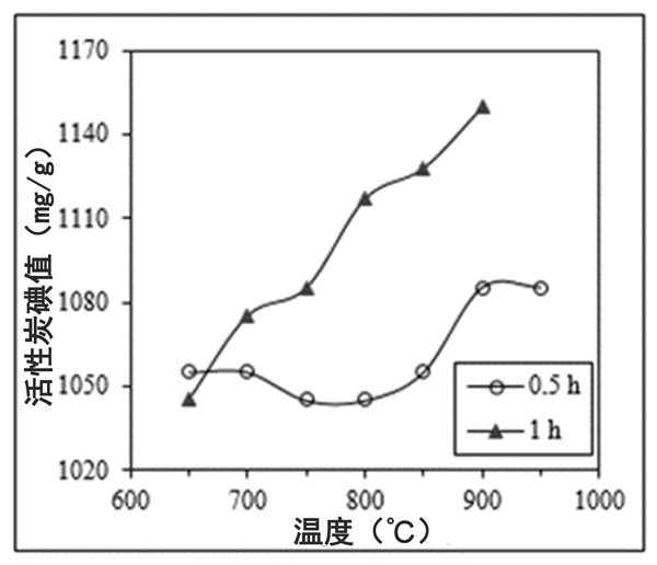 圖2:活化時間(0.5和1h)對用H 2 SO 4(在50°C下30%v / v)洗滌的廢活性炭的碘值(mg I 2/g活性炭)的影響在不同溫度(650°C至950°C)下重新活化。