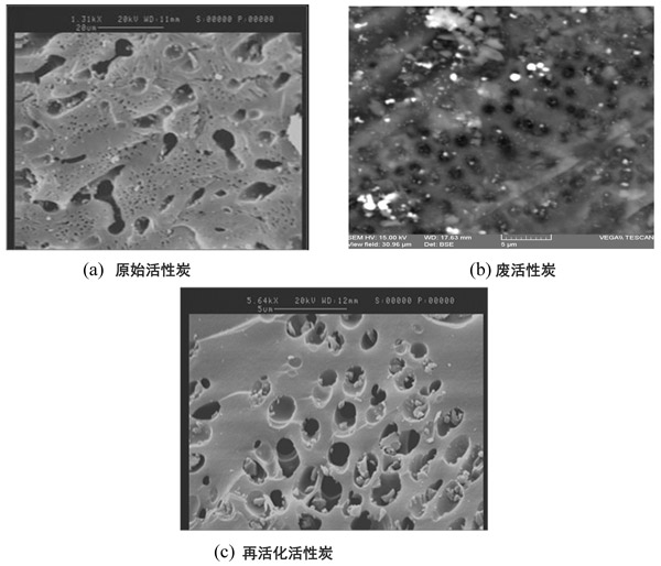 圖3:(a)原始活性炭(b)廢活性炭和(c)重新活化的炭的掃描電子顯微鏡(SEM)圖像。