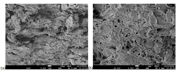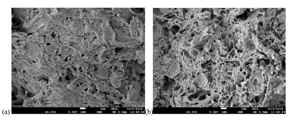 根據(jù)觀察到的活性炭微觀結(jié)構(gòu)來進行形態(tài)研究。圖1顯示了在650°C(a)和850°C(b)兩種不同溫度下用25%H3PO4制成的活性炭的比較。可以看出,與650℃相比,在850℃下制備的活性炭具有稍大的孔?梢缘弥左w積隨著活化溫度的升高而逐漸增加。