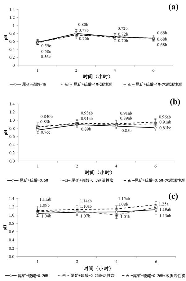 在H2SO4-1M中用活性炭和木質活性炭處理的對照尾礦在圖2提供,(3a)中的pH變化,H2SO4-0.5M(3b)和H2SO4-0.25M(3c)浸出溶液。關于浸出實驗期間的pH演變,盡管活性炭顯示堿性pH,但在不存在或存在活性炭的情況下觀察到小的差異。選擇硫酸作為浸出液是因為它可以有效地選擇性溶解Zn化合物而不是Pb和Ca。相反,樣品中的氧化鉛和碳酸鹽會溶解在硫酸溶液中,然后以硫酸鉛的形式沉淀。然而,當在浸出液中加入活性炭時,氧化還原電位的下降幅度高于加入木質活性炭后。這一事實可能與碳基材料與系統(tǒng)中存在的氧化劑種類和礦物質之間的不同相互作用有關。事實上,觀察到在木質活性炭催化的黃銅礦浸出過程中氧化還原電位降低,并將這種影響歸因于礦物和木質活性炭在酸性介質中的電偶相互作用。