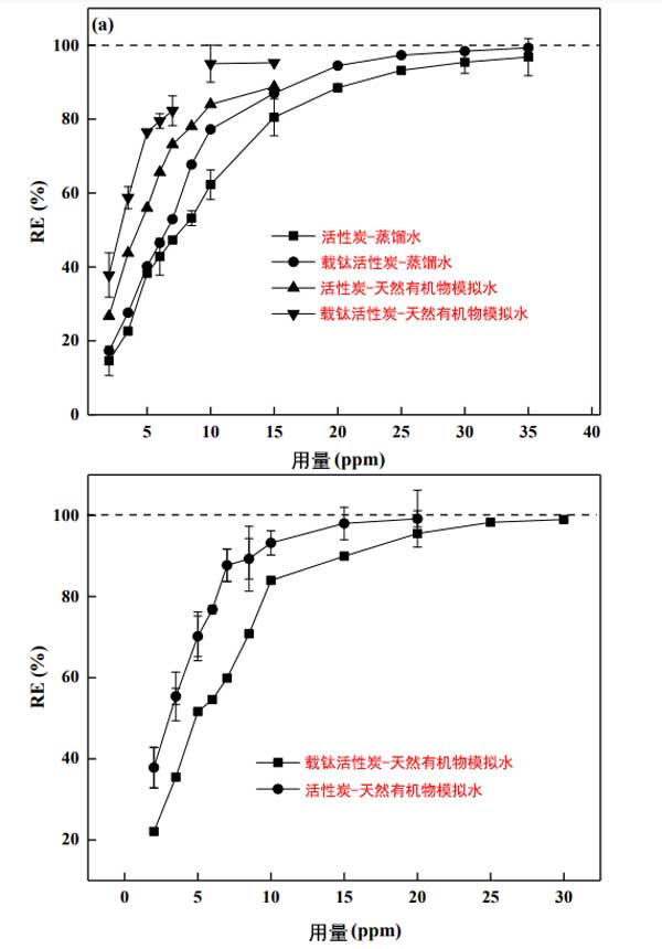 天然有機(jī)物的主要成分是腐植酸和單寧酸,因?yàn)樗鼈兤毡榇嬖谟诟鞣N天然水中。圖3顯示了從蒸餾水和天然有機(jī)物水中消除2-甲基異冰片的情況,這取決于光降解前后催化劑的用量。如圖3a所示,發(fā)現(xiàn)兩種催化劑在天然有機(jī)物水中的去除更接近。然而,腐植酸和單寧酸的存在導(dǎo)致活性炭和載鈦活性炭對2-甲基異冰片的吸附能力顯著降低。此外,為了達(dá)到氣味閾值濃度值,兩種催化劑在低天然有機(jī)物濃度的水中所需的劑量比在蒸餾水中增加了大約一倍。這種現(xiàn)象表明天然有機(jī)物和2-甲基異冰片之間對于兩種催化劑的活性位點(diǎn)存在競爭關(guān)系。同時(shí),值得注意的是,當(dāng)微生物分子接近模型污染物時(shí),競爭吸附最強(qiáng)。然而,在光降解后,載鈦活性炭對2-甲基異冰片的去除效率顯著提高(圖3b)。