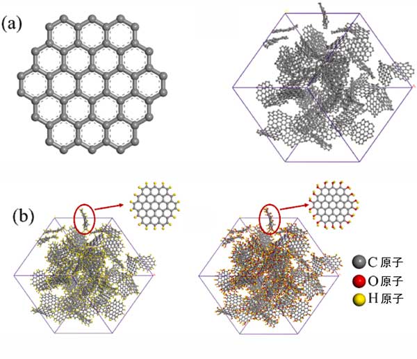 圖1:(a)顯示了基本活性炭的結(jié)構(gòu)和微孔活性炭模型,(b)具有不同官能團(tuán)的微孔活性炭(a)–H;(b)–OH。
