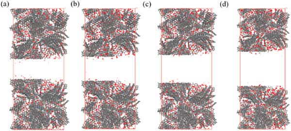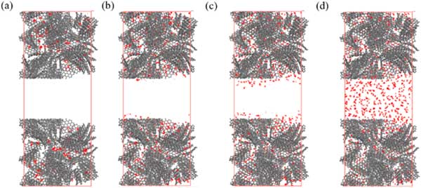 活性炭由微孔和介孔組成,介孔在一定程度上影響吸附特性。因此,研究芳烴在具有分級(jí)孔的活性炭上的吸附特性,以明確介孔對(duì)下一節(jié)吸附特性的影響。在這些模擬中,選擇了密度為0.8g/cm3的微孔活性炭,不同樣品的中孔尺寸分別選擇為2.0、2.5、3.0和4.0nm。具有不同層次孔隙的活性炭。分層孔隙活性炭模型構(gòu)建為密度在0.6-0.7g/cm3的合理范圍內(nèi)。圖3展示了苯分子在p=10kPa下具有不同中尺度孔徑的活性炭上的吸附位點(diǎn)分布。這表明即使在p=10kPa時(shí),苯的吸附也僅發(fā)生在介孔表面,而不會(huì)填充介孔的空隙空間。圖4說明了對(duì)二甲苯在具有3.0nm孔的活性炭上從低壓到高壓的吸附位點(diǎn)的變化。從圖4(a)-(d)可以看出,只有微量的對(duì)二甲苯分子被吸附到微孔上,當(dāng)壓力為1.25kPa時(shí),微孔逐漸被填滿,中孔壁上出現(xiàn)吸附位點(diǎn)。當(dāng)壓力增加到3.75kPa時(shí),吸附位點(diǎn)增加,介孔中開始出現(xiàn)多層吸附,最終介孔充滿對(duì)二甲苯,此時(shí)壓力可達(dá)6.25kPa。