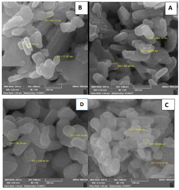 未活化的活性炭與物理活化的活性炭復(fù)合材料的合成使用水熱法制備了。根據(jù)該方法,金屬化氧化鐵銅納米粒子懸浮在30mL燒杯中,直接加入活性炭懸浮液,超聲處理30分鐘。然后將這兩種懸浮液在一個燒瓶中混合,在80℃下連續(xù)攪拌,直到溶劑完全蒸發(fā)。此時,收集所得固體并在100℃下干燥12小時獲得活性炭復(fù)合材料。利用掃描電鏡對合成的這幾種活性炭材料的表面形貌進(jìn)行了研究。純氧化鐵銅納米粒子的表面形態(tài)如圖1A所示,它顯示了中等均勻的球形顆粒,粒徑約為31nm;钚蕴繌(fù)合材料的圖像如圖1C所示,該圖像顯示了較小的均勻性,粒徑相對較大,并且存在顆粒團(tuán)聚。這很可能是由于復(fù)合材料中存在活化后的活性炭,這可以增強(qiáng)表面協(xié)同效應(yīng),促使顆粒尺寸增加,因為在這些條件下晶體生長。復(fù)合材料氮鐵銅的圖像如圖1D所示,從該圖像可以看出,存在相對均勻的分布,球形顆粒幾乎與氧化鐵銅相似,但氧化鐵銅氮的粒徑相對大于氧化鐵銅。這可能是由于摻雜氮物種后晶體生長所致。