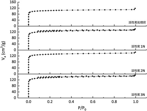 使用BET法的氮?dú)馕锢砦椒治鰞x確定吸附劑吸附等溫線并測(cè)量比表面積和孔體積。等溫曲線如圖1所示。圖1顯示處理前后的所有活性炭均為I型等溫線。I型等溫線表明吸附劑通常是微孔的,暴露的表面幾乎完全位于微孔內(nèi)部,幾乎沒(méi)有或沒(méi)有外表面可供進(jìn)一步吸附一次充滿吸附質(zhì)。I型向P/P0軸凹,吸附量達(dá)到極限值(P/P0→1)P/P0是相對(duì)壓力,它是吸附氣體平衡壓力與其飽和平衡蒸汽壓力的比值。圖1中清楚地描述了酸處理可以增加吸附氮?dú)獾捏w積,這表明增加的孔體積。