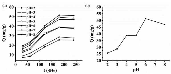 圖1:(a、b)不同pH值對吸附劑的影響和不同pH值下的大吸附容量。