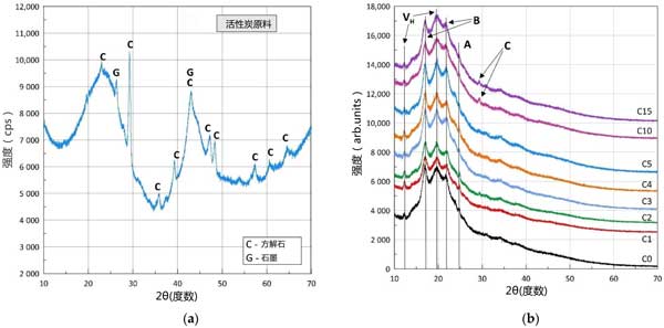 圖2:(a)原料粉狀活性炭的XRD圖,(b)含0%(C0)、1%(C1)、2%(C2)、3%(C3)、4%(C4)、5%(C5)、10%(C10)和15%(C15)活性炭的熱塑性淀粉樣品的XRD圖。
