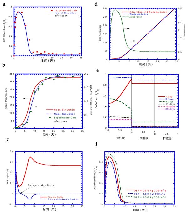 圖3:實(shí)驗(yàn)結(jié)果和模型模擬(a)COD流出物,(b)生物質(zhì)生長,(c)流入生物膜和活性炭的通量,(d)COD去除,(e)COD曲線,和(f)COD流出物各種有機(jī)負(fù)載率(OLR)。