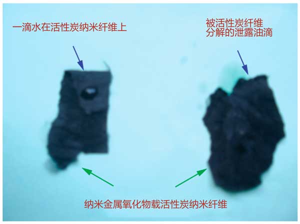 圖4:顯示活性炭復(fù)合纖維疏水和親油行為的照片。