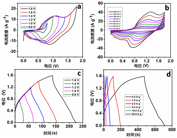 超級電容器裝置的制造是集成陰極(氧化鎳),陽極(活性炭)使用纖維素濾紙(在2.0M/KOH電解液中浸泡放置)分離,然后用絕緣膠帶包裹。陽極和陰極具有相似的幾何表面積,再經(jīng)過合適的重量比來制成電容器。圖2a顯示了超級電容器件在各種截止區(qū)域中的CV曲線,掃描速率為50mVs-1。從圖中可以看出,電容器件的CV曲線呈現(xiàn)出典型的準(zhǔn)矩形電容性能,這對應(yīng)于雙電層電容器和贗電容的相互貢獻。此外,當(dāng)增加工作截止區(qū)時,會發(fā)生更多的法拉第電化學(xué)反應(yīng)。當(dāng)工作電位超過1.7V時,也會在CV曲線上注意到氧氣的釋放;钚蕴/氧化鎳器件很大程度上取決于截止區(qū)域。因此,選擇1.6V作為隨后研究超級電容器件電化學(xué)性能的潛在窗口區(qū)域。圖2b顯示了活性炭電容器件在0到1.6V的截止區(qū)域內(nèi)的各種掃描速率下的CV曲線。電流密度隨著掃描速率的增加而增加,并且氧化峰電位轉(zhuǎn)移到更正的電位,類似三電極器件的結(jié)果。