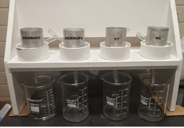 酸二氫鉀在去離子水中制備磷溶液,將活性炭稱重到試管中,,并用36mL的16.3mg/L-1正磷酸鹽平衡,僅包括沙子或浮石樣品。將管在端到端振蕩器上以90min-1的頻率平衡24小時(shí),并通過(guò)0.2-μm膜過(guò)濾器過(guò)濾上清液。根據(jù)鉬酸鹽法,使用UV-VIS分光光度計(jì)分析濾液中的正磷酸鹽。總共16根柱子(直徑7.62厘米,高7.62厘米)用沙子或浮石填充到4.56厘米的深度(圖2)。十六列對(duì)應(yīng)于由兩種過(guò)濾器(沙子或浮石)和四種活性炭改進(jìn)材料組成的實(shí)驗(yàn),包括對(duì)照(無(wú)添加活性炭),一式兩份。將含活性炭改良劑和不含活性炭改良劑(按重量計(jì)5%)的沙子或浮石混合,然后將其干填充到柱中。每個(gè)柱子的底部都用粗棉布保護(hù),這樣可以大限度地減少過(guò)濾材料的損失。