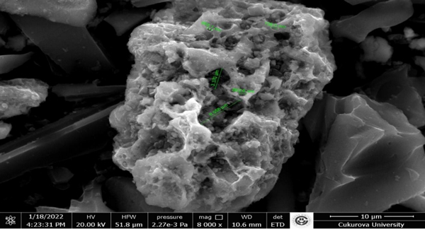 活性炭有著耐用且良好的粘合結(jié)構(gòu),在獲得的SEM圖像中,活性炭具有孔徑在250nm之間的中孔和超過50nm的大孔結(jié)構(gòu)(圖1)。