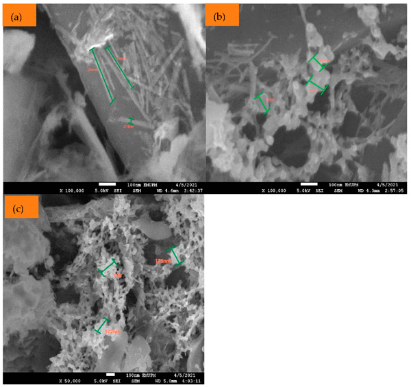 圖1:樣品的代表性FESEM圖像。(a)Mn(0.5%)-Mo(0.1%)/活性炭,(b)Mn(0.5%)-Mo(0.5%)/活性炭和(c)Mn(0.5%)-Mo(1%)/活性炭這三種催化劑。