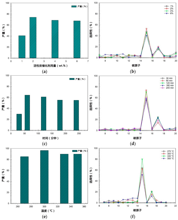活性炭催化劑負(fù)載對烴類轉(zhuǎn)化和產(chǎn)物分化的影響如圖3a、b所示。脫氧反應(yīng)在惰性N2氣氛中在300℃的反應(yīng)溫度和500rpm的攪拌速度下進(jìn)行30分鐘。評估了催化劑負(fù)載量(即1-6wt.%)的影響。數(shù)據(jù)表明,脫氧性能和分化均在1-2wt.%的活性炭催化劑負(fù)載范圍內(nèi)升高,但隨后在催化劑負(fù)載>2wt.%后下降。產(chǎn)率和產(chǎn)物選擇性當(dāng)使用2wt.%時(shí),其效果更好,即分別為47.13%和72.85%。相反,在催化劑負(fù)載量超過2wt.%時(shí),脫氧性能和選擇性的下降可能反映了催化劑的負(fù)載過重,由于不同的活性位點(diǎn)的剩余活性位點(diǎn),這將促進(jìn)對二級和并行反應(yīng)的驅(qū)動(dòng)。