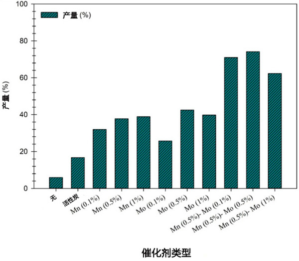 當(dāng)廢油對Mn/活性炭和Mn-Mo/活性炭催化劑樣品進(jìn)行脫氧反應(yīng)時(shí),產(chǎn)物包括液態(tài)正烷烴和烯烴,以及含氧中間體物質(zhì),例如醇,醛和酮,以及汽化的CO和CO2。單獨(dú)或兩種活性炭金屬催化劑生產(chǎn)提供了優(yōu)異的轉(zhuǎn)化和完全差異化在廢油的溶解氧過程;钚蕴看呋瘎┑姆磻(yīng)性能主要取決于Mn和Mo表面密度以及催化劑的酸度。脫氧反應(yīng)在300℃的反應(yīng)溫度和500rpm的攪拌速度下在惰性N2中進(jìn)行30分鐘氣氛。對活性炭上Mn和Mo負(fù)載百分比的篩選表明,與0.1wt.%相比,將活性炭負(fù)載0.5wt.%將烴產(chǎn)率從31.9%提高到37.9%,并將Mo負(fù)載量從0.1wt.%提高至0.5wt.%導(dǎo)致產(chǎn)率從25.7%增加到42.4%。篩選結(jié)果表明,最佳的錳負(fù)載百分比為0.5wt.%,并選擇了此百分比。Mo對Mn催化劑的影響從0.1到1wt.%負(fù)載百分比進(jìn)行了研究,結(jié)果表明0.5wt.%的Mn和Mo是合適百分比,烴收率為74%(圖2)。