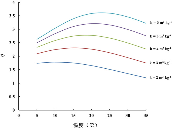查看活性炭的檢測器的結(jié)果(圖2)可以看出,相同溫度下的CF0在活性炭之間存在差異。這意味著不同活性炭的吸附能力存在一些差異。在所有模塊設(shè)計(jì)中,假設(shè)21℃下的吸附容量值為4m3/kg-1。然而,由于我們的實(shí)驗(yàn)結(jié)果表明不同活性炭材料的k可能存在差異。不同k值的結(jié)果如圖3所示?梢钥闯,對于區(qū)間2-6m3/kg-1內(nèi)的所有k值,η的變化(例如最大/最小比率)與溫度的變化遠(yuǎn)小于未包裝傳感器觀察到的230-305%的變化。
