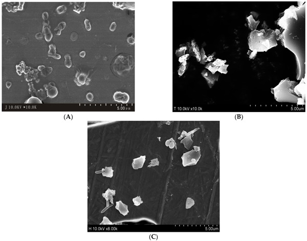 圖2:掃描電子顯微鏡圖像:(A)降解細(xì)菌;(B)活性炭;(C)活性炭載菌。