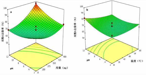 圖3:雙酚A去除效率對磁力活性炭影響的響應面3-D(a)pH和劑量以及(b)pH和溫度。