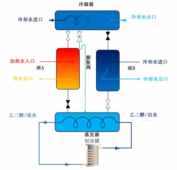 吸附制冰系統(tǒng)的兩床配置來檢查使用50%活性炭、10%聚乙烯醇和40%石墨烯納米片的復合吸附劑。制冰可以通過循環(huán)乙二醇來完成,乙二醇在-2℃下進入吸附制冷的蒸發(fā)器,并帶有外部制冰塊,如圖1所示。復合活性炭吸附劑應用于吸附床中普通銅管的外表面上,加熱和冷卻流體被泵入管內。加熱和冷卻水在四個過程(預熱、解吸、預冷和吸附)之間在兩個床之間切換,完成一個床循環(huán)。根據(jù)操作模式,切換閥用于將蒸發(fā)器和冷凝器與吸附床連接起來。