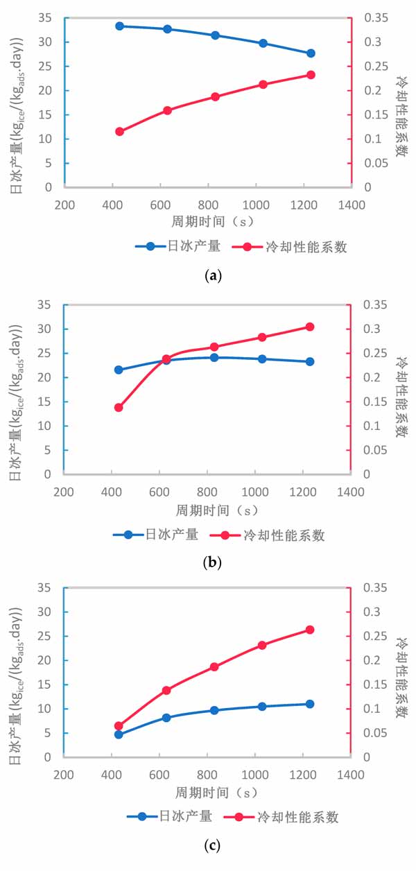 在活性炭厚度為2、5和10mm時,循環(huán)時間的變化對制冰系統(tǒng)的每日制冰量和冷卻性能系數(shù)的凈影響如圖4所示?傮w而言,在給定范圍內增加循環(huán)時間可以增加或減少系統(tǒng)的每日制冰量,具體取決于活性炭復合材料的厚度。然而,無論活性炭復合材料的厚度如何,系統(tǒng)的冷卻性能系數(shù)通過增加循環(huán)時間而增加。盡管如此,系統(tǒng)冷卻性能系數(shù)在1230的較長循環(huán)時間和5mm活性炭復合材料厚度下達到其最大值。通過增加活性炭復合材料的厚度,日冰產(chǎn)量在不同循環(huán)時間內的變化范圍顯著減小,這可以通過比較圖4a-c中給出的每日制冰量范圍看出。這歸因于活性炭復合材料厚度較厚時有效吸收的減少。