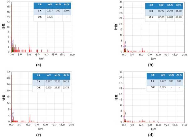 通過觀察摩擦學測試的結(jié)果,很明顯平均磨痕直徑和質(zhì)量損失的減少結(jié)果具有相似的趨勢。然而,當將活性炭添加到潤滑脂中時,質(zhì)量損失值顯示出更陡峭的趨勢。為了進一步了解質(zhì)量損失結(jié)果以及表面的磨痕形貌,應用了與能量色散X射線(EDX)系統(tǒng)集成的SEM。測試氣缸磨痕的EDX光譜是針對放大500倍的SEM圖像確定的,以便從磨痕的表面軌跡中獲得關于接觸表面上的摩擦膜的沉淀元素(碳和氧)的必要信息。圖3顯示了以500倍放大倍率成像時的磨損表面形態(tài)。在具有粗糙表面形態(tài)的商業(yè)油脂樣品的情況下,圖像描繪了淺槽和深槽(圖3a)。另一方面,活性炭樣品和2wt.%其他樣品的磨損表面(圖3b,c)顯示出淺槽,帶有少量深槽點和光滑的形貌,而在0.5wt.%活性炭+2wt.%其他樣品的混合樣品僅顯示出薄槽(圖3d)。