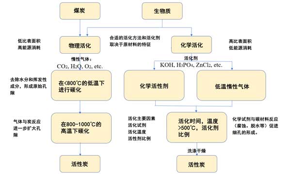 活化過程是活性炭制備的核心階段,是前驅體孔隙結構的進一步擴大。活化過程包括三個主要階段:焦油物質的消除、基本碳晶體的燃燒和碳顆粒的氧化。主要因素有活化類型、活化劑、活化溫度、浸漬比、活化時間、氣體分壓等。活化方法可分為物理活化、化學活化、物化偶聯(lián)活化法、微波活化、模板法等,最常用的方法是物理活化和化學活化。物理活化和化學活化衍生的活性炭制備見圖2。