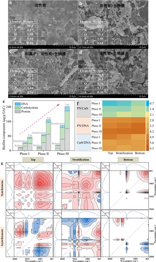 活性炭是生物膜生長的優(yōu)良載體,它可以快速從液相中吸收有機(jī)物和營養(yǎng)物質(zhì),用于生物膜中微生物的新陳代謝。圖1顯示了有和沒有生物膜的活性炭形態(tài)動力學(xué)、生物膜組分的濃度和反應(yīng)器不同位置的官能團(tuán);钚蕴恐械脑刂饕ㄌ(C,88.4%)、氮(N,4.87%)、氧(O,5.68%),以及少量的磷(P,0.04%),活性炭表面為比較順利。生物膜形成后,活性炭表面附著大量生物質(zhì),變得更加粗糙。由于生物膜中蛋白質(zhì)、碳水化合物和DNA的積累,包括N、O和P在內(nèi)的主要元素的比例顯著增加(圖1e)。值得注意的是,硫元素也被檢測到,這應(yīng)該有助于活性炭和生物膜對LAS(磺酸基團(tuán))的吸附。