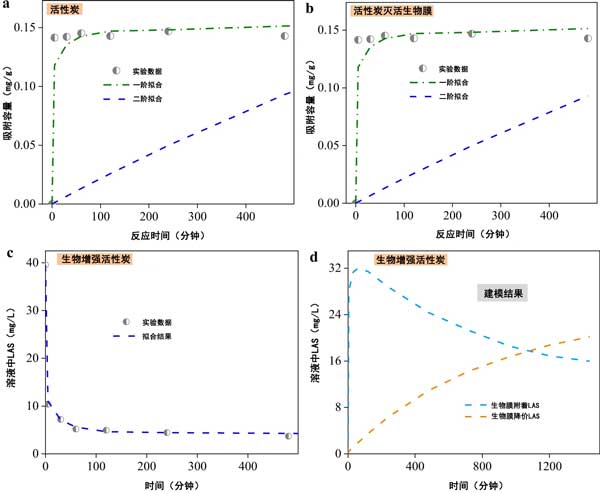 圖3:磺酸基團(tuán)去除動力學(xué)在活性炭、b滅活生物膜-活性炭、c生物增強(qiáng)活性炭和d生物增強(qiáng)活性炭中的LAS去除動力學(xué)的批量實驗。