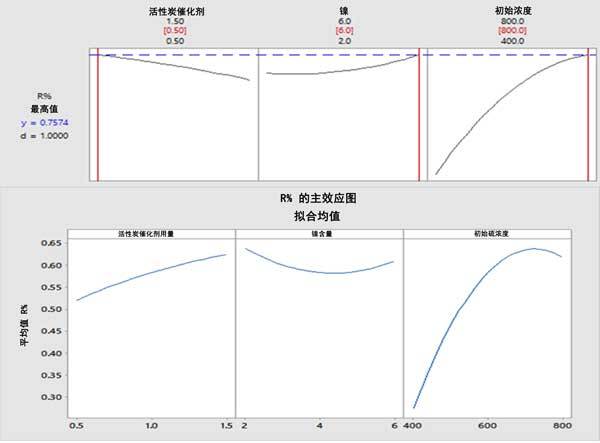 圖2:研究變量對二苯并噻吩轉(zhuǎn)化率的影響,轉(zhuǎn)化率隨著活性炭催化劑用量和初始硫濃度的增加而增加,隨著Ni負(fù)載量的增加而降低(上圖)。對于活性炭催化劑用量、Ni負(fù)載量和初始硫濃度,在0.5g、6%和700ppm時(shí),最佳二苯并噻吩轉(zhuǎn)化率分別為75.74%(下圖)。