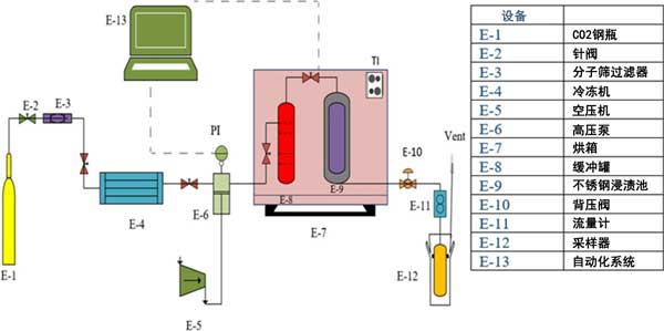 首先,來自儲罐的CO2通過標(biāo)稱尺寸為1µ的過濾器,以避免任何雜質(zhì)進入工藝路徑。然后,CO2被引導(dǎo)至冰箱單元,其溫度降至-10℃和60bar。液化CO2使用往復(fù)泵加壓,并轉(zhuǎn)化為殼管式配置的調(diào)壓鼓。在這個鼓中,流體溫度被設(shè)置為適當(dāng)?shù)臏囟纫赃_到超臨界流體條件。該鼓的設(shè)計旨在減少波動,熱交換通過使用溫度精度設(shè)置為1K的1000W元件循環(huán)水進行。壓力表安裝在調(diào)壓鼓的輸出端,以顯示出口流體壓力。之后,液體被引導(dǎo)到裝有10克活性炭和玻璃珠的萃取池。在提取單元的輸入和輸出處安裝了兩個孔隙率為1微米的過濾器,以防止顆粒逸出。細(xì)胞中玻璃珠的存在使CO2均勻分布在提取單元內(nèi)。在用SC-CO2加載萃取池后,將萃取池設(shè)置在適當(dāng)?shù)臏囟群蛪毫ο录s45分鐘。在靜態(tài)階段之后,動態(tài)階段從打開采樣閥開始。為了防止閥門凍結(jié),它被包裹在加熱元件中。在動態(tài)時間內(nèi),使用冰柜將樣品采集溫度保持在0℃以下。每個實驗一式三份進行,圖1顯示了超臨界流體裝置的詳細(xì)信息,通過將每個初始活性炭的溶質(zhì)重量除以計算超臨界回收率。