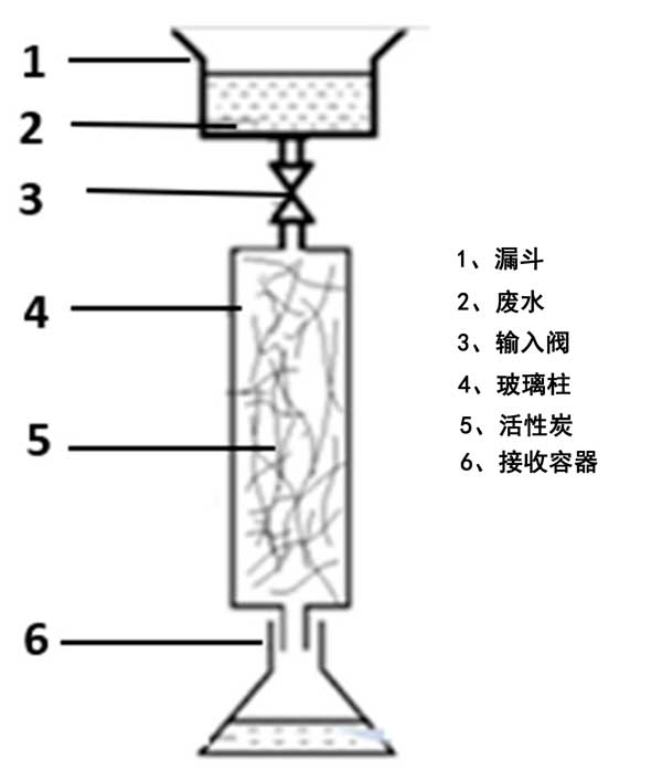 通過(guò)在密封玻璃瓶中將已知量(4.0g)的活性炭與50mL實(shí)際廢水樣品進(jìn)行反應(yīng),進(jìn)行批量吸附平衡實(shí)驗(yàn)。測(cè)試了具有不同初始硫濃度(100、300、500、800和1000mg·L-1)的五個(gè)樣品。將瓶子在恒溫?fù)u床上放置24小時(shí),直至達(dá)到平衡(最終pH值:10.5)。用于床吸附實(shí)驗(yàn)的裝置的示意圖如圖2所示。將碳化纖維填充到玻璃柱中以研究它們的吸附能力。廢水被引入漏斗并通過(guò)輸入閥以將流量調(diào)節(jié)為4–5.10m3·h-1。首先,使用流經(jīng)柱的蒸餾水潤(rùn)濕床吸附裝置以改善活性炭纖維的潤(rùn)濕特性。其次,允許漏斗中的煉油廠廢水樣品內(nèi)容物通過(guò)活性炭床通過(guò)重力排放到接收容器。每小時(shí)回收處理過(guò)的水。