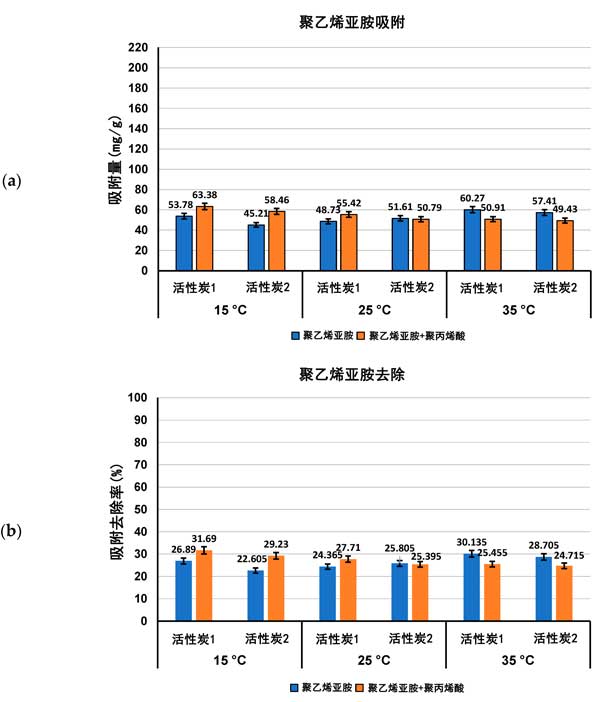 圖2:聚乙烯亞胺吸附量(a)及其從活性炭表面去除的百分比(b)在單一和混合吸附物系統(tǒng)中,在三個(gè)檢測溫度pH3下。