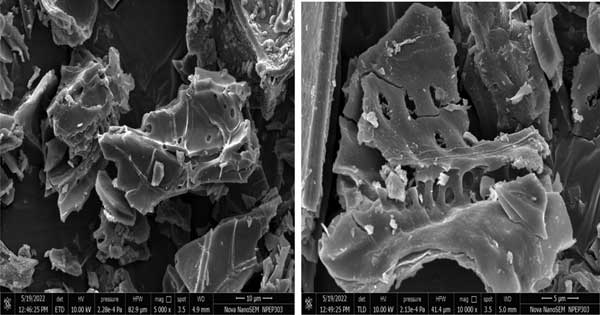 使用掃描電子顯微鏡分析獲得的活性炭的孔結(jié)構(gòu)。SEM設(shè)備具有超高分辨率低電壓成像和獨(dú)特的低真空能力。SEM圖像是在15kV時(shí)以1nm、1kV時(shí)1.4nm、3kV時(shí)1.8nm和30Pa的不同分辨率拍攝的。觀察活性炭的表面物理形態(tài)是通過(guò)使用SEM完成的技術(shù)。圖3顯示活性炭的SEM圖像。這表明活性炭的外表面具有均勻開放的大孔。此外,活性炭的表面是高度多孔的,其特點(diǎn)是不均勻。同樣清楚的是,活性炭在其外表面具有微孔和空腔,暗區(qū)位于該處。經(jīng)受碳化后,活性炭由于ZnCl2的蒸發(fā)而產(chǎn)生空隙(稱為氣孔)。可以將這些孔視為通向微孔網(wǎng)絡(luò)的通道。