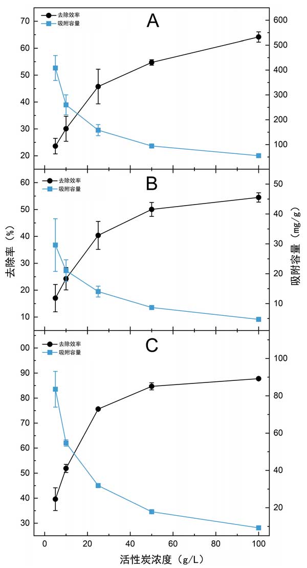 圖1:用幾種濃度的活性炭處理農(nóng)用工業(yè)沼渣時,計算的COD(A)、PO4-P(B)和總酚(C)參數(shù)的吸附容量和去除效率。