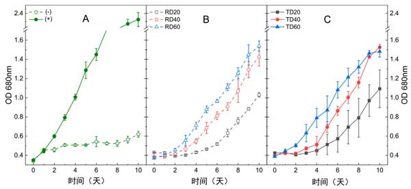 厭氧消化物中存在的大量和微量營養(yǎng)素的多樣性可能有利于藍(lán)藻代謝。即使活性炭預(yù)處理顯著降低了幾個參數(shù),包括COD、濁度和苯酚含量,原料(4405mg/L)和預(yù)處理消化物(4220mg/L)的銨濃度仍然高于藍(lán)藻螺旋藻支持的閾值濃度(100–150毫克/升)。在這種情況下,使用以三種不同稀釋率稀釋的原始和預(yù)處理消化物進(jìn)行了一系列藍(lán)藻毒性測定:20×、40×和60×。未稀釋的消化物,無論是否用活性炭處理,都沒有在本實驗中進(jìn)行測試,因為初步培養(yǎng)分析表明它們對培養(yǎng)物毒性太大(數(shù)據(jù)未顯示)。因此,該實驗的目的是比較以不同稀釋率稀釋的兩種消化物以及兩個對照組之間的生長性能。連續(xù)測量680nm處的OD超過10天,以評估所有條件下的生長情況。在三種不同稀釋因子下測試的原始消化物(RD)和處理過的消化物(TD)條件下,觀察到類似生長趨勢(圖2A、B)。當(dāng)增加原始和預(yù)處理消化物的培養(yǎng)基稀釋倍數(shù)時,會產(chǎn)生更高的生長反應(yīng)。同樣,滯后期受原始消化物和預(yù)處理消化物的稀釋因子的影響,觀察到的滯后期越長,消化物越濃縮。例如,稀釋20倍和40倍的未處理消化物的滯后期分別持續(xù)4天和2天。在本研究中,根據(jù)稀釋倍數(shù)和預(yù)處理條件,使用221和71mg/L之間的初始銨氮(NH4+-N)濃度,鈍頂藻能夠增殖。一般而言,原始消化物和預(yù)處理消化物的更高稀釋度產(chǎn)生更高的生長。