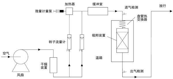 動態(tài)吸附技術(shù)用于測量甲苯吸附平衡等溫線。圖1描述了實驗裝置。通過該裝置獲得吸附飽和的活性炭。在不同的溫度和濃度下,測量了甲苯的飽和吸附容量。入口溫度和甲苯濃度設定為25–180℃和5–50g/m3;钚蕴课降募妆綒怏w濃度為15g/m3。使用重量分析技術(shù)測量吸附等溫線。實驗裝置以實驗室環(huán)境空氣為氣源,通過鼓風機將空氣送入裝置。在硅膠干燥裝置中除去水蒸氣后,通過數(shù)顯質(zhì)量流量計的控制,按計算出的比例分成兩路。單向氣流以設定濃度進入氣體發(fā)生裝置,即甲苯揮發(fā)后的載氣,在氣體緩沖室中與反向流動的稀釋氣體充分混合后進入吸附系統(tǒng)。在吸附系統(tǒng)中,吸附柱緊密均勻地填充CTC100活性炭顆粒,并用鐵架垂直放置在設定實驗溫度的恒溫干燥箱中;旌霞妆綒怏w首先在恒溫干燥箱內(nèi)通過氣體預熱管道達到實驗溫度,然后進入裝有活性炭的吸附柱進行吸附實驗。吸附氣體通過檢測口進入檢測系統(tǒng),智能FID通過連續(xù)采樣測量甲苯出口濃度。當氣體發(fā)生裝置產(chǎn)生的入口濃度與智能FID檢測的出口濃度一致時,吸附柱中的活性炭達到吸附平衡。吸附氣體通過檢測口進入檢測系統(tǒng),智能FID通過連續(xù)采樣測量甲苯出口濃度。當氣體發(fā)生裝置產(chǎn)生的入口濃度與智能FID檢測的出口濃度一致時,吸附柱中的活性炭達到吸附平衡。吸附氣體通過檢測口進入檢測系統(tǒng),智能FID通過連續(xù)采樣測量甲苯出口濃度。當氣體發(fā)生裝置產(chǎn)生的入口濃度與智能FID檢測的出口濃度一致時,吸附柱中的活性炭達到吸附平衡。