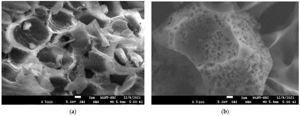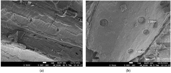 使用FESEM分析觀察了活性炭產(chǎn)品的浸漬和碳化溫度影響的形態(tài)變化。圖1a、b描繪了木質(zhì)素在被激活之前的表面形態(tài)。它顯示出厚而平坦的圖案,中間有小裂縫。這歸因于大量的木質(zhì)素,一種酚類聚合物,賦予植物結(jié)構(gòu)強(qiáng)度,使其具有堅(jiān)硬粗糙的木材狀結(jié)構(gòu)。在圖1b中,發(fā)現(xiàn)前體具有壓實(shí)的表面,上面有淺而堵塞的孔隙圖案。這可能是由于烘箱干燥過(guò)程中預(yù)處理和加熱過(guò)程的反應(yīng)。從圖1a、b,由于無(wú)孔表面的存在,表面清楚地顯示為不令人滿意的吸附材料。