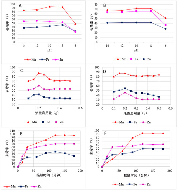 在分批吸附研究中,pH值是一個(gè)重要因素,它會(huì)通過(guò)改變所用吸附劑的表面電荷分布來(lái)影響吸附過(guò)程。在6和14的范圍內(nèi)觀察到木材加工廢水中重金屬(Mn、Fe和Zn)的pH相關(guān)影響。圖3A、B清楚地表明,當(dāng)纖維板加工廢水中的Mn、Fe和Zn分別使用pH8時(shí),兩種活性炭均獲得最佳結(jié)果。
