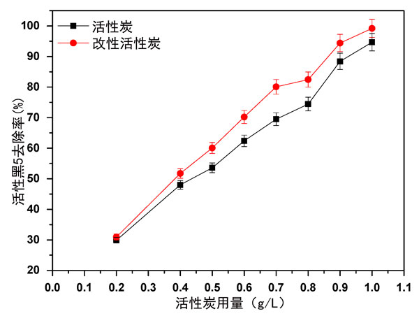 圖2:與活性炭相比,改性活性炭用量對活性黑5吸附的影響。
