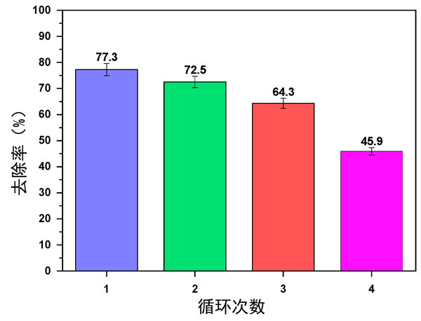 通過回收研究調(diào)查了改性活性炭的再利用以從廢水中去除活性黑5。進行實驗時,最初使用100mg/L活性黑5和0.8g/L的改性活性炭,pH值為2。在第一個循環(huán)之后,使用0.01M/NaOH溶液對所使用的改性活性炭顆粒進行處理大約2小時。此后,用蒸餾水沖洗顆粒以除去任何殘留的堿。選擇被認為可接受的重復時間,以便能夠在后續(xù)循環(huán)中重復使用吸附劑。研究結(jié)果如圖3所示。在用1M/NaOH處理成功再生后,解吸的改性活性炭能夠重復使用多達四個循環(huán)以去除活性黑5;钚院5的去除百分比在第一個循環(huán)中約為77.3%,在第四個循環(huán)后下降至約45.9%?偟膩碚f,這項研究證明了將改性活性炭吸附劑重復使用四個循環(huán)以從廢水中去除活性黑5的潛力。