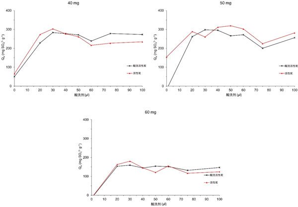 圖1:添加酸洗劑的活性炭用量為40、50和60mg時(shí)的硫酸根離子吸附能力。
