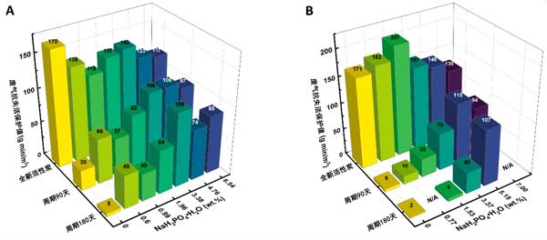 用磷酸三鈉12水合物(Na3PO4·12H2O)在活性炭上進(jìn)行類似的實(shí)驗(yàn),活性炭失活后干燥。實(shí)驗(yàn)在11.03wt.%的濃度下進(jìn)行,相當(dāng)于4.00wt.%的NaH2PO4·H2O的摩爾當(dāng)量。很明顯,磷酸三鈉在抑制衰老方面并不有效。經(jīng)過3個月的加速失活,保護(hù)值甚至低于未改性的活性炭。然而,Na3PO4·12H2的效率可能會降低如果在酸性環(huán)境中或與酸或酸性化合物一起添加,效果會更好。這是因?yàn)樗嵝詶l件可以向磷酸鹽提供質(zhì)子,導(dǎo)致磷酸鈉有效地充當(dāng)Na2HPO4或NaH2PO4?傮w而言,結(jié)果表明,在由磷酸及其三種鈉鹽組成的磷酸鹽添加劑中,一元鹽NaH2PO4·H2O是抑制失活最有效的添加劑。