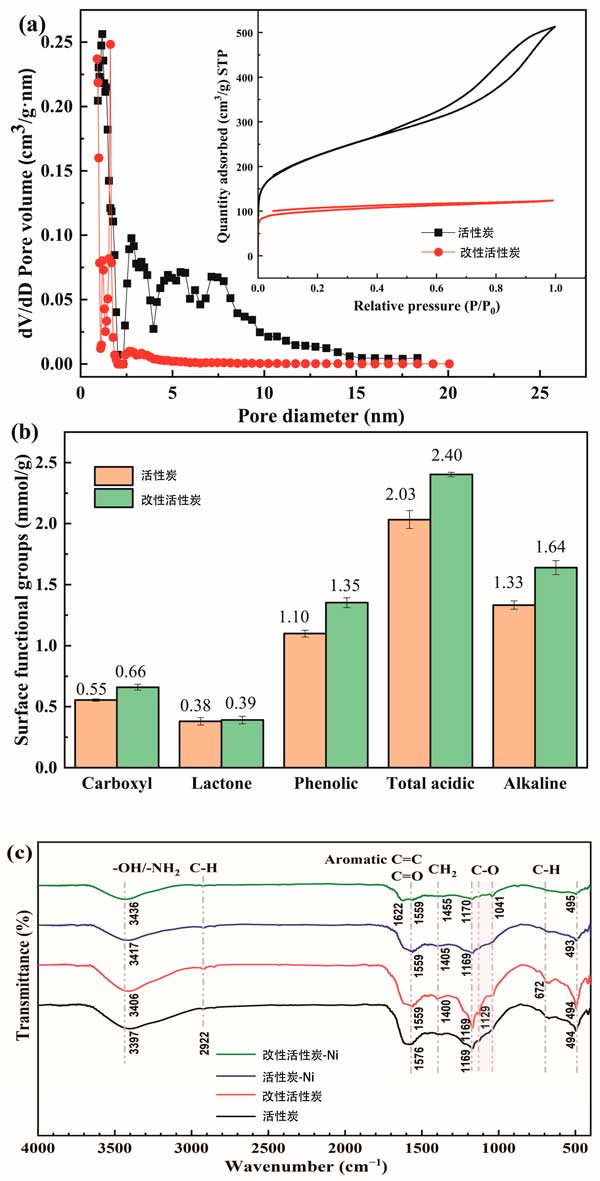 圖1:活性炭和改性活性炭的表征:(a)孔徑分布和氮?dú)馕?解吸等溫線;(b)通過(guò)Boehm滴定進(jìn)行表面官能團(tuán)分析;(c)Ni(II)吸附前后的FTIR光譜。