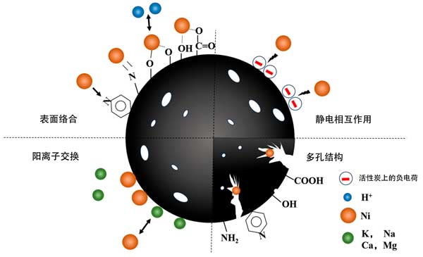 圖2:Ni(II)在活性炭上的吸附機(jī)理。