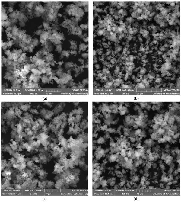 活性炭由各種富含碳的材料制成,例如煤、椰殼或木材,通過活化過程可提高其孔隙率和表面積。這種高表面積加上孔隙網(wǎng)絡(luò)使活性炭能夠吸附各種物質(zhì)。其吸附能力源于物理吸附(污染物受范德華力控制)和化學(xué)吸附(碳表面和污染物分子之間發(fā)生相互作用)。圖1a–d中的SEM 圖像用于說明吸附劑的表面形貌。這些SEM圖像顯示活性炭的形貌為無定形。
